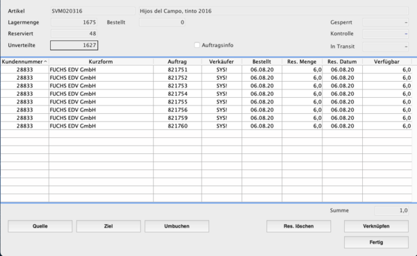 - In der Liste wird Ihnen die für den Auftrag reservierte und die verfügbare Menge angezeigt.