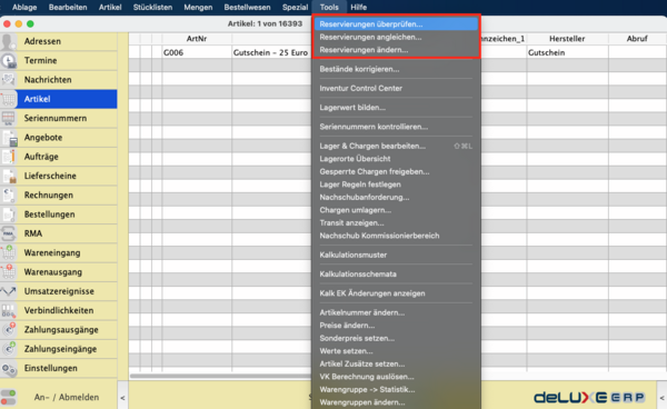 Da diese Funktion erhebliche Rechnerleistung benötigt, sollte sie nicht pauschal auf eine große Anzahl von Artikeln ausgeführt werden. Nutzen Sie im Vorfeld die Funktion Reservierungen überprüfen, um die entsprechenden Artikel ausfindig zu machen.