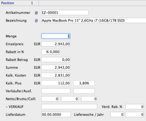 Wurde ein Artikel ausgewählt, erscheinen im linken oberen Teil des Layouts die Artikelnummer, die Bezeichnung, der Verkaufspreis und die kalkulatorischen Kosten.