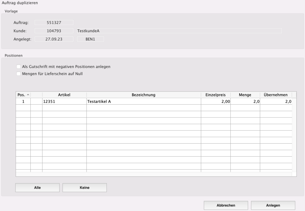 Ein Auftrag kann über Abwicklung -> Auftrag duplizieren (⌘D) dupliziert werden. Es öffnet sich dann eine Maske in der die Positionen ausgewählt werden können, die übertragen werden sollen.
