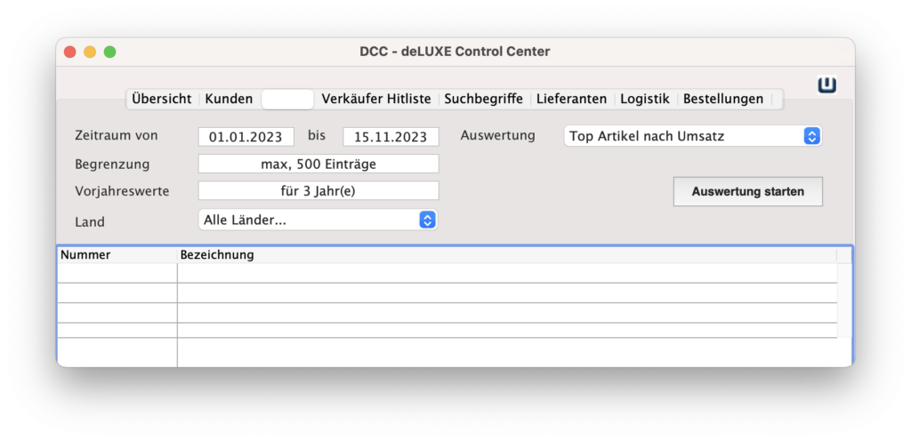 Besitzen Sie eine Lizenz für das Modul DCC – deLUXE Control Center können Sie überall im deLUXE-ERP über Ablage / deLUXE Control Center (⌘⇧D) ein Analysefenster anzeigen lassen.