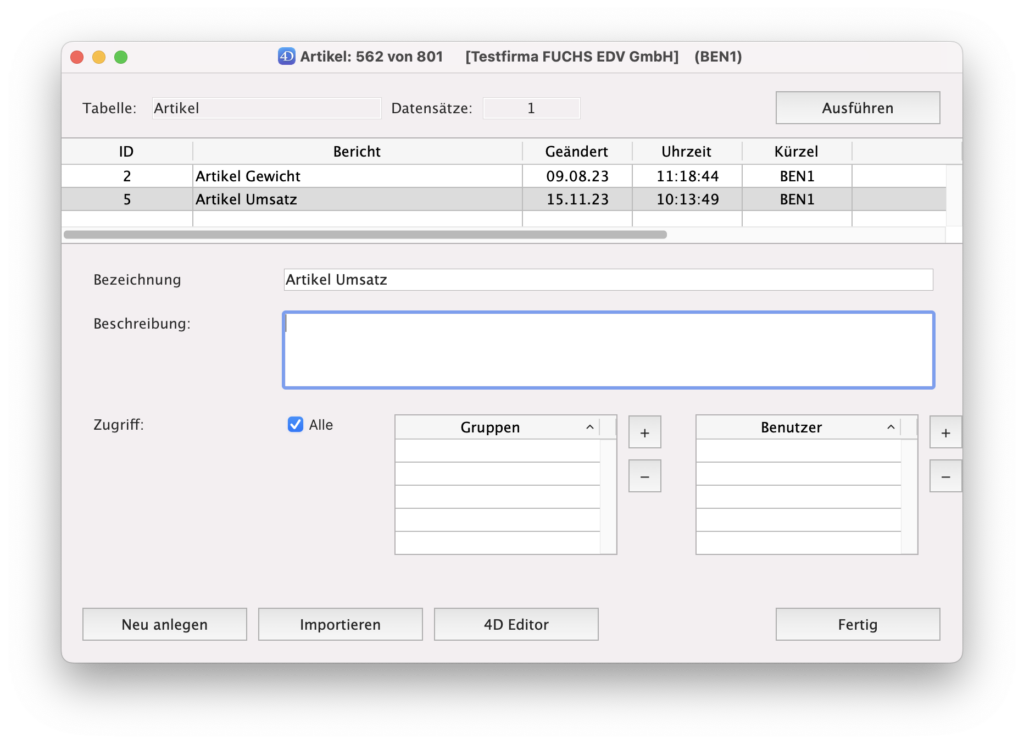 | Wichtig: Für Berichte müssen alle gewünschten Artikel markiert sein. Wählen sie also vorher mit ⌘A alle Artikel aus. |