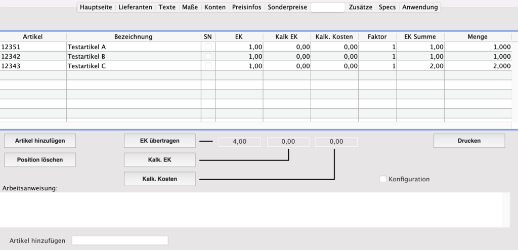Hier können dann auch Mengen der Bestandteile und Arbeitsanweisungen zum Zusammenstellen der Artikel hinterlegt werden. Unabhängig davon kann dieser Stücklistenartikel wie jeder herkömmliche Artikel bearbeitet werden.